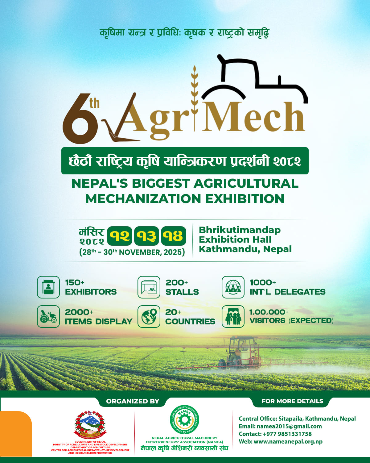छैठौं राष्ट्रिय कृषि यान्त्रिकरण प्रदर्शनी—२०८२ भृकुटीमण्डप प्रदर्शनी हल, प्रदर्शनी मार्ग, काठमाडौं २०८२ मंसिर १२, १३ र १४ गते (November 28-30, 2025)